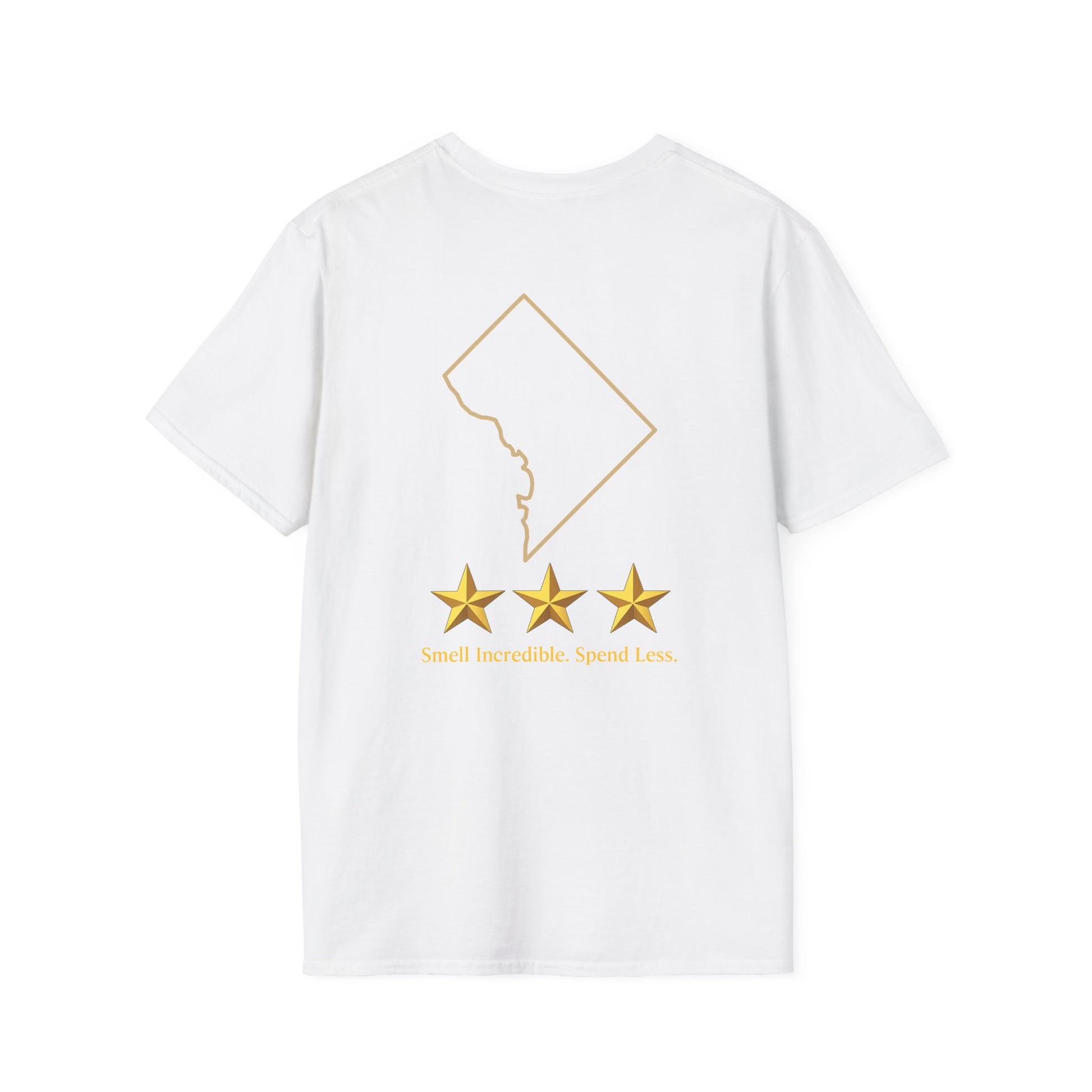 This white T-shirt features the Scent Syndicate™ logo in gold on the front, paired with a DC-inspired graphic and three gold stars on the back. Designed to stand out without being loud, it keeps the look refined while staying true to the brand’s identity.